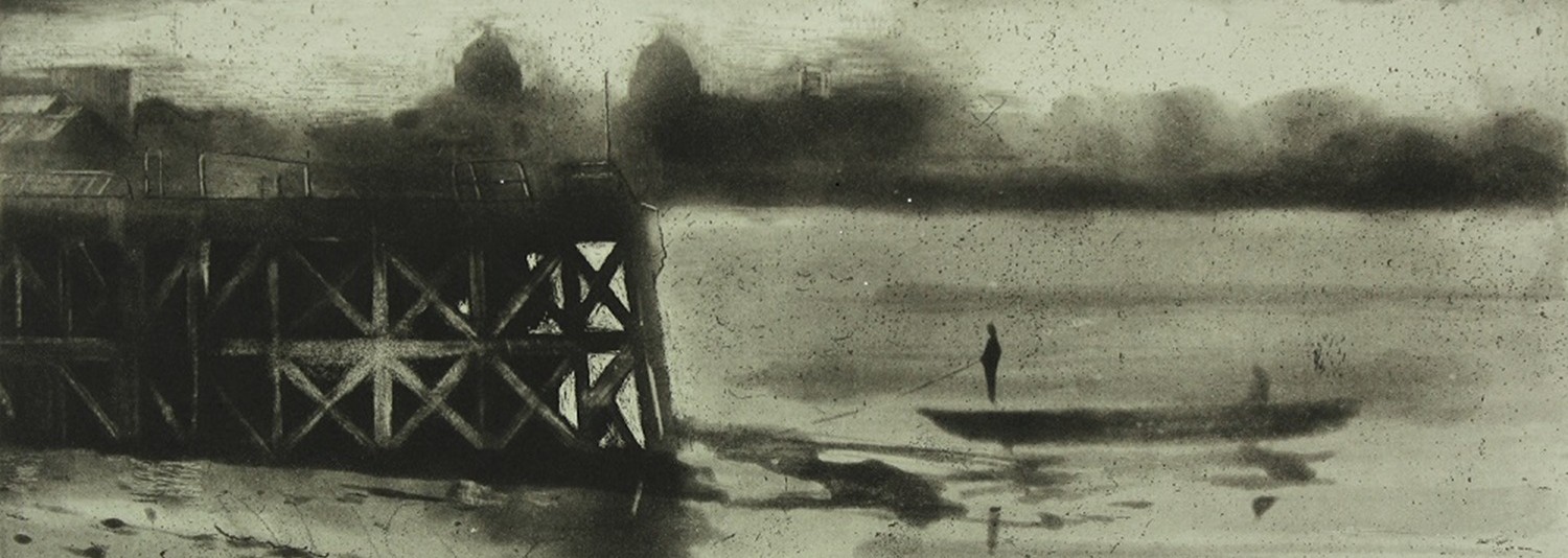 Nick's work is influenced by the architecture of London and the structures of the River Thames along it's path to the marshes and the estuary. His recorded observations merge with memories and re-imagined scenes. They form the selection of etchings shown here.